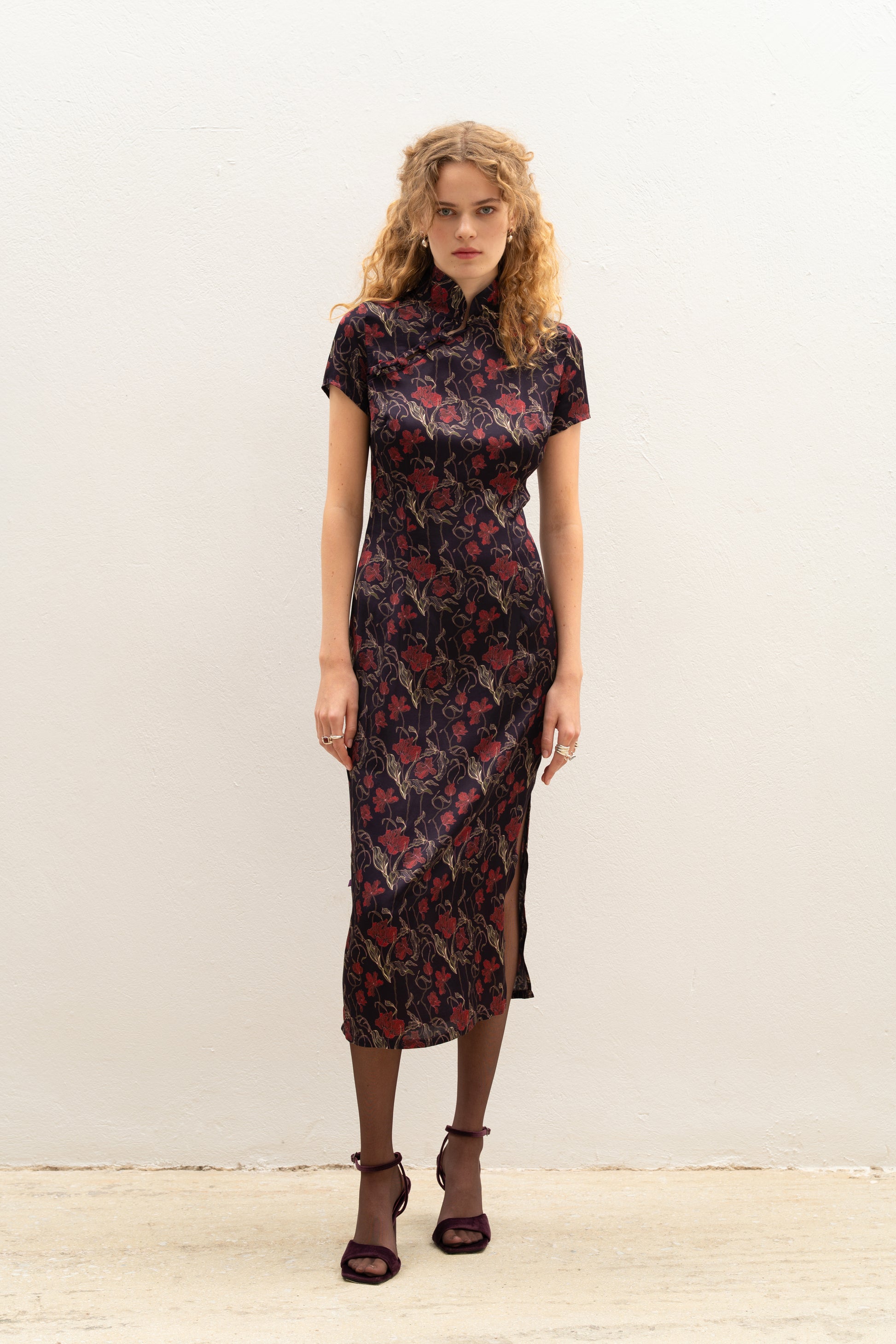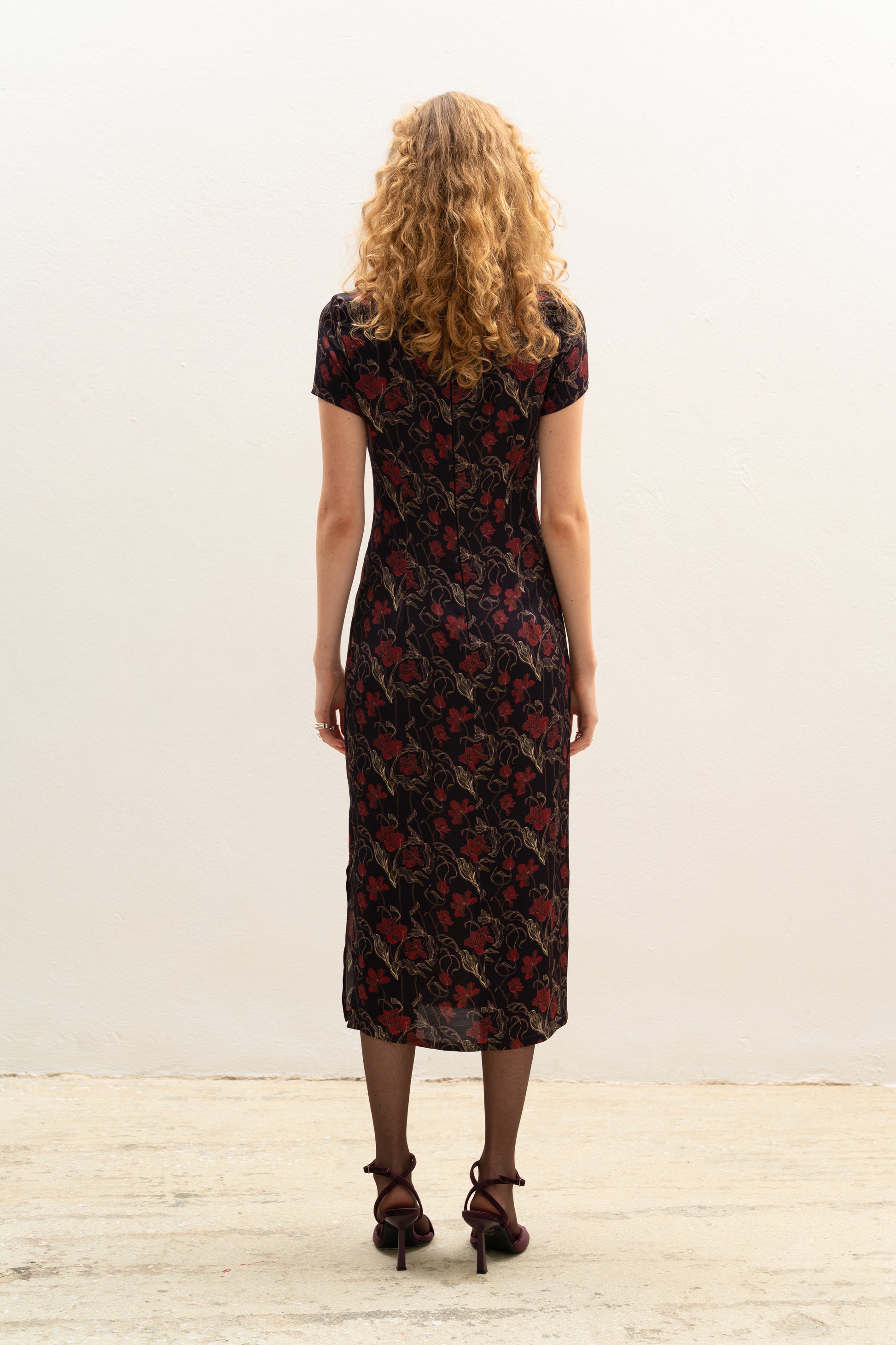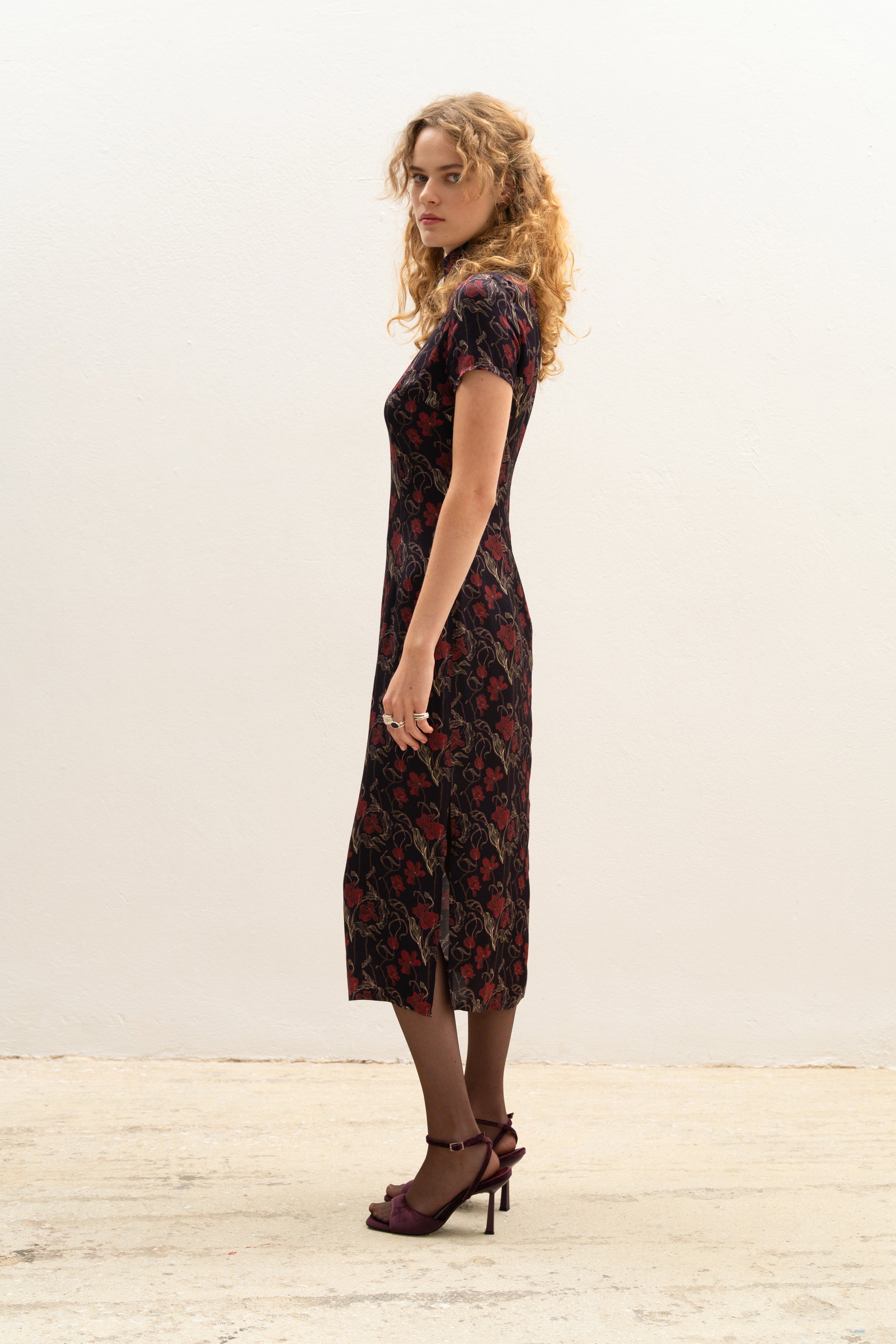 Midi φόρεμα με πλαϊνή σχισμή και ψηλό γιακά Mao με τύπωμα